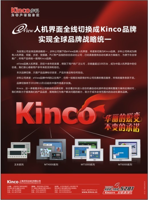 為實(shí)現(xiàn)公司全球品牌戰(zhàn)略統(tǒng)一,步科公司旗下的eView品牌人機(jī)界面,將逐漸切換為Kinco品牌。步科公司將成為擁有人機(jī)界面、伺服、步進(jìn)、變頻器、PLC等產(chǎn)品線的綜合自動化公司,已經(jīng)具備提供自動化解決方案能力,為便于在全球推廣,所有產(chǎn)品將統(tǒng)一使用Kinco品牌。