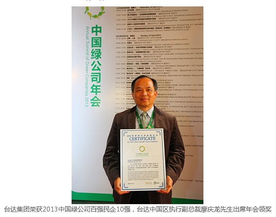 臺達集團獲選2013中國綠公司百強并榮登民營企業十強,網絡投票得票數也位居民企第一位,此為臺達第四年進入百強榜。由中國企業家俱樂部及道農研究院聯合主辦的中國綠公司百強年會及頒獎典禮,4月20-21日于昆明舉行,臺達中國區執行副總裁廖慶龍受邀代表領獎,并于圓桌會上擔任領銜佳賓,引導企業代表探討企業商譽及透明度管理。