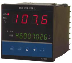 HC-908系列多功能流量積算儀 ●適用范圍 與各種流量傳感器或變送器、溫度傳感器或變送器和壓力變送器配合使用,可對各種液體、蒸汽、天然氣、一般氣體等流量參數進行測量顯示、累積計算、報警控制、變送輸出、數據采集及通訊。 ●功能特點 全范圍自動溫度、壓力補償運算,補償方式任意設定 線性積算、開方積算任意設定 瞬時流量、累積流量、溫度、壓力多種參數顯示 小信號切除功能,切除范圍0-5%可選 累積流量值可通過面板按鍵清零,清零操作可鎖 掉電保護功能,累積流量值掉電保持時間大于5年,所有設定值掉電后永久保持 先進的模塊化結構,配合功能強大的儀表芯片,功能組合、系統升級非常方便 ●主要技術指標 基本誤差:0.5%FS或 0.2%FS±1個字 分 辨 力:1/20000、14位A/D轉換器 顯示方式:雙排同時顯示,上排四位數碼管顯示瞬時流量,下排八位數碼管顯示累積流量采樣周期:0.5S 報警輸出:瞬時流量二限報警,繼電器輸出觸點容量 AC220V/3A 變送輸出: 4~20mA、0~10mA、1~5V、0~5V 精度:±0.3%FS 通訊輸出:接口方式--隔離串行雙向通訊接口RS485/RS422/RS232/Modem 波特率--300~9600bps內部自由設定 饋電輸出:DC24V/50mA 電 源:開關電源 85~265VAC 功耗4W以下