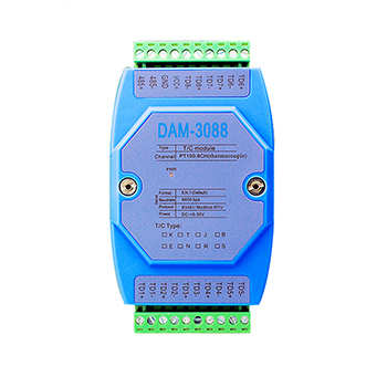 DAM-3088 簡介: DAM-3088模塊是全新一代基于嵌入式系統的熱電偶溫度采集模塊,采用標準 DIN35 導軌安裝方式,現場安裝簡單,使用靈活;應對各種現場應用。模塊配置有 RS232 接口,方便與 PC 或 PLC 通信,模塊配置有 RS485 接口,可單獨與 PC 或 PLC 通信,也可以與多個 485 模塊組網使用。 參數: 隔離耐壓:DC 2500V ESD 保護:±15KV 供電范圍:DC +8~+36V 功耗:小于 1W 工作溫度:-40℃~+80℃ 工業級V0級防火塑料外殼保障產品應用各類環境安全 安裝方式:標準 DIN35 導軌安裝 溫度采集 輸入通道數: 4\8 路 K 型熱電偶 輸入溫度范圍:-40℃~1370℃ 轉換速率:3 次/秒(單通道) 轉換分辨率:0. 1℃ 支持RS485,RS232可定制CAN 測量精度:±0.5℃(典型值) 輸入端過壓保護,過流保護,并有低通濾波 RS485 連接 DAM 系統模塊 RS485 接口為標準 RS485 接口,采用差分信號邏輯,邏輯“1”以兩線間的電壓差為+(2~6)V 表示;邏輯“0”以兩線間的電壓差為-(2~6)V 表示。RS485 設備組網連接非常簡單,只需要將設備正端和負端并接入總線即可;當其通信距離較長時應該特別注意網絡拓撲,RS485 網絡拓撲一般采用終端匹配的總線型結構,不支持環形或星形網絡,從總線到每個節點的引出線長度應盡量短,以便使引出線中的反射信號對總線信號的影響最低,更多詳細信息請參考相關資料。