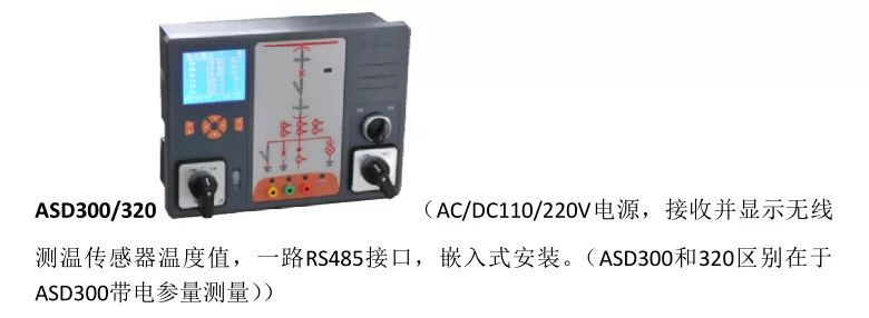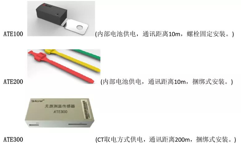 說(shuō)明:ASD300/320 智能操控裝置最多可連接 12 路無(wú)線溫度傳感器,無(wú)源(CT 取電)方式為 ATE300(捆綁式安裝),有源(電池供電)方式為 ATE100(螺栓式安裝,主要用于電纜/銅排等螺絲固定的搭接點(diǎn))和 ATE200(表帶式,主要用于斷路器觸頭等接點(diǎn)捆綁安裝,因安裝較 ATE100 更方便,電纜/銅排等搭接點(diǎn)也常選用)。