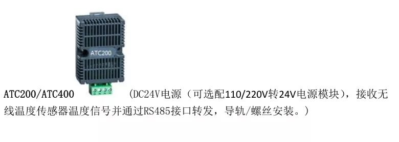 說(shuō)明:ATC400 無(wú)線溫度收發(fā)器最多可連接 240 路無(wú)源無(wú)線溫度傳感器 ATE300(捆綁式安裝),可接收多臺(tái)柜內(nèi)的無(wú)線溫度傳感器溫度信號(hào)。